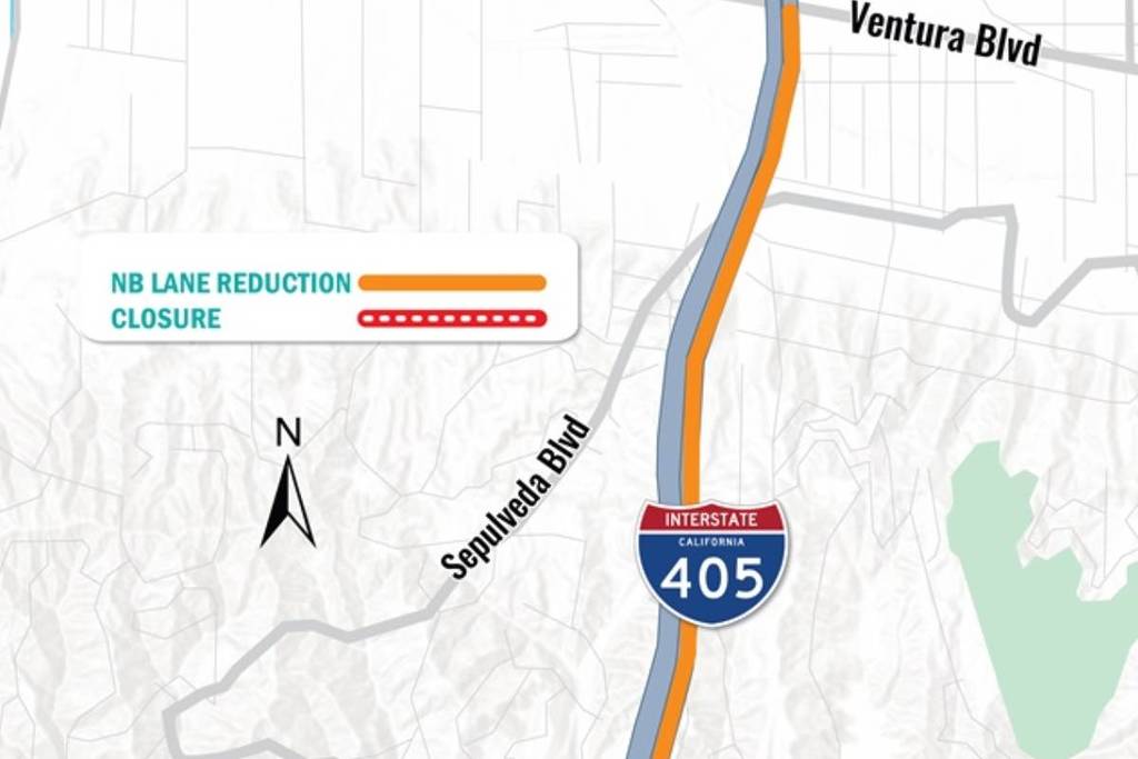 - Sperrung von Auffahrten: Die Auffahrt vom Skirball Center Drive zur I-405 in Richtung Norden bleibt während des gesamten Arbeitszeitraums gesperrt.