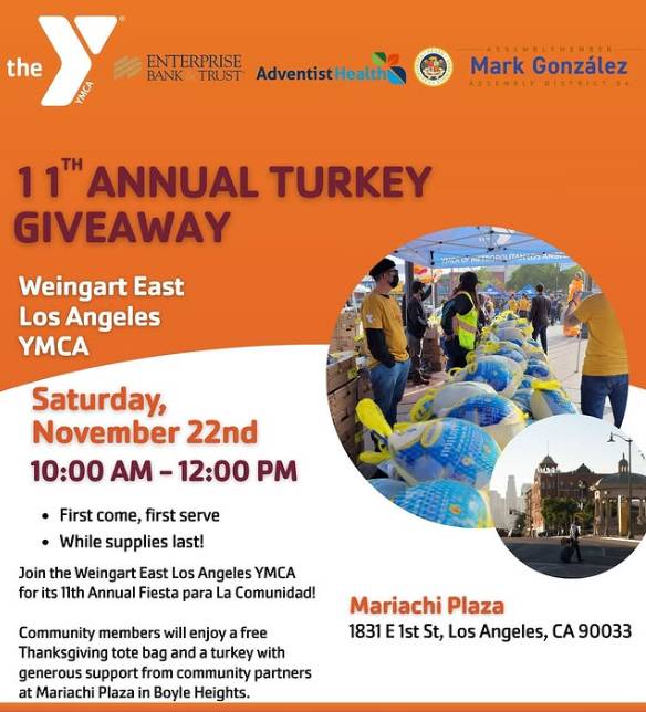 La YMCA Weingart East Los Angeles está organizando su 11ª entrega anual de pavos «Fiesta para La Comunidad » en Mariachi Plaza. De 10 a.m. a 12 p.m., los asistentes recibirán un pavo gratis y una bolsa de Acción de Gracias, hasta agotar existencias. Los interesados en donar alimentos o ser voluntarios de la YMCA pueden inscribirse aquí.
