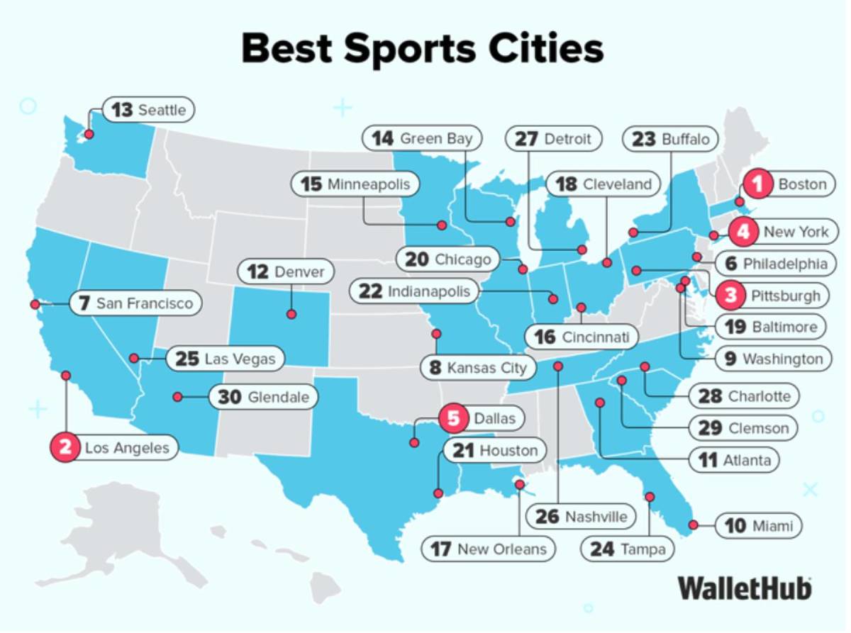 Para encontrar las mejores ciudades deportivas, WalletHub combinó los resultados de sus clasificaciones anteriores y ponderó cada deporte según el número de adultos estadounidenses que lo siguen, basándose en datos de Gallup: