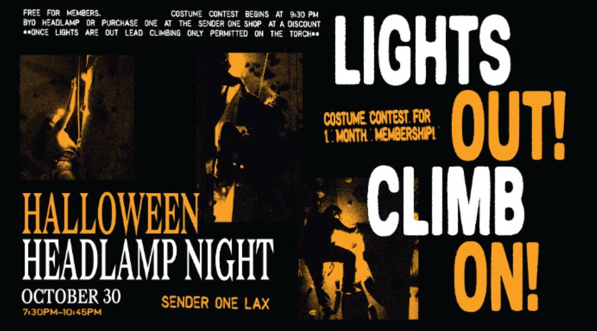 Participez à des dynos terribles, des crimps effrayants, des pinches pesantes et des envois effrayants en grimpant dans l’obscurité à Sender One LAX! Venez déguisés pour avoir une chance de gagner un mois d’abonnement au concours de costumes. Apportez votre propre lampe frontale ou achetez-en une au Sender One Shop. De plus, vous bénéficierez d’une réduction de 25 % sur les prix de vente au détail lorsque vous achèterez une lampe frontale et des articles de fantaisie. L’extinction des feux est prévue à 19h30 et le concours de costumes à 21h30. Vous pouvez RSVP ici !