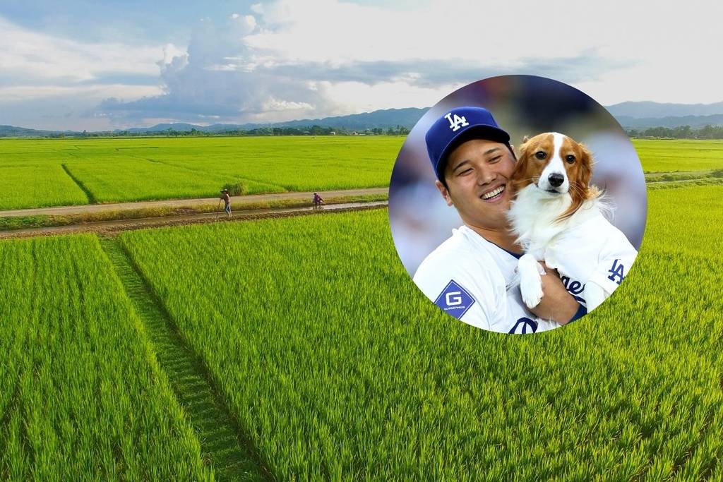 Une rizière d’environ 32 000 pieds carrés à Oshu, dans la préfecture d’Iwate, la ville natale du double joueur, a été transformée en un portrait grandissant de Shohei Ohtani et de son adorable chien Decoy (Dekopin).